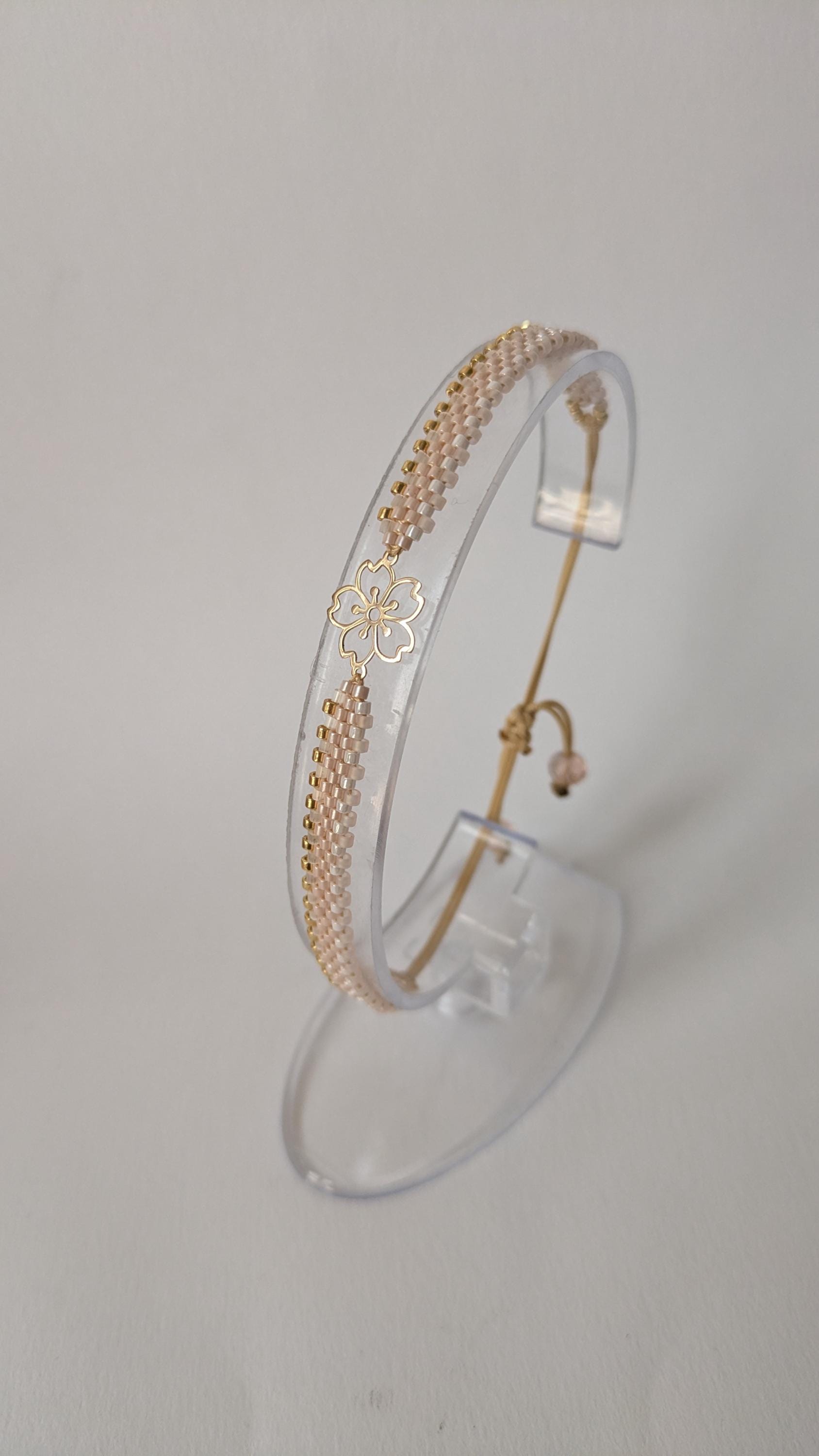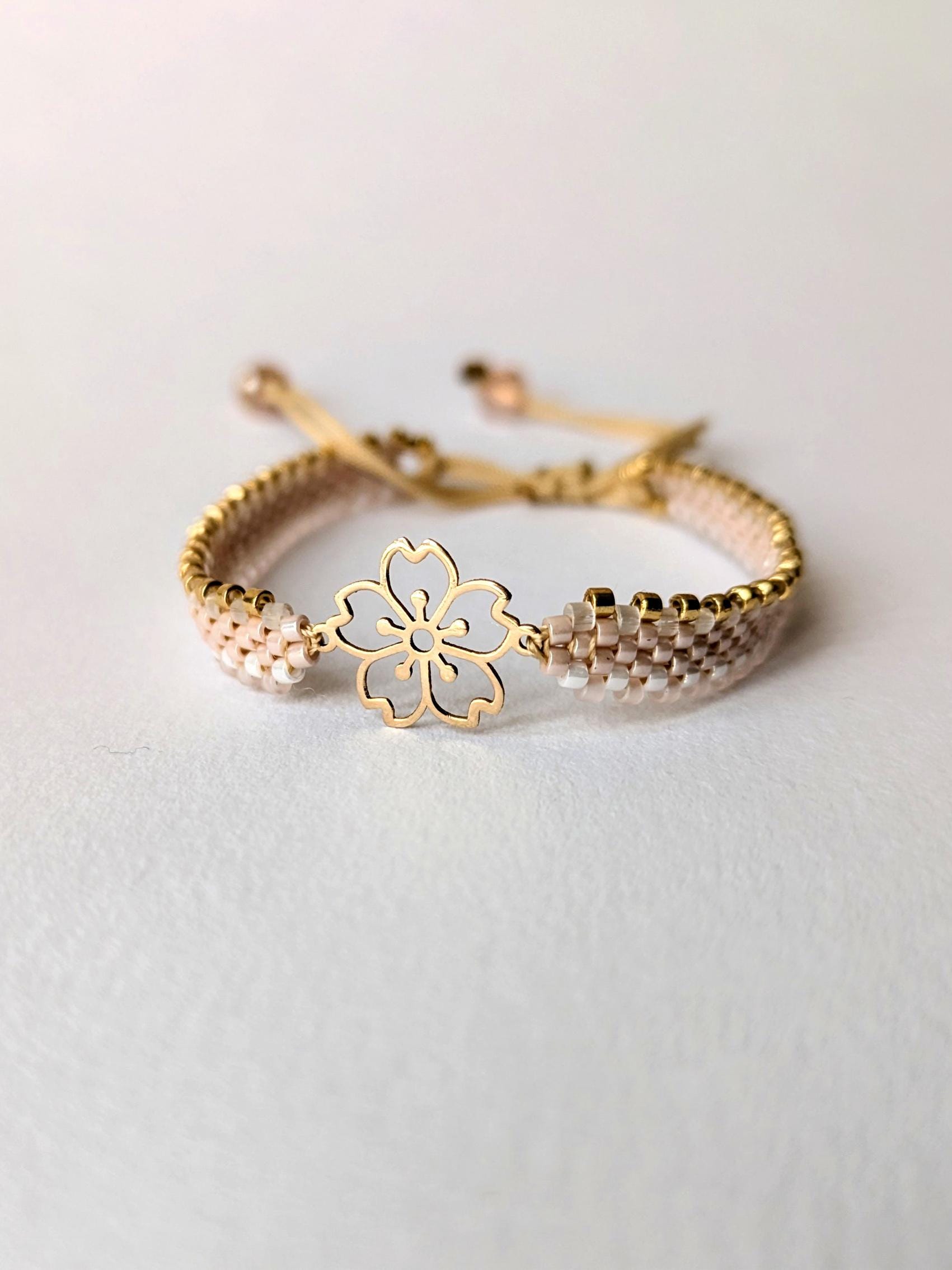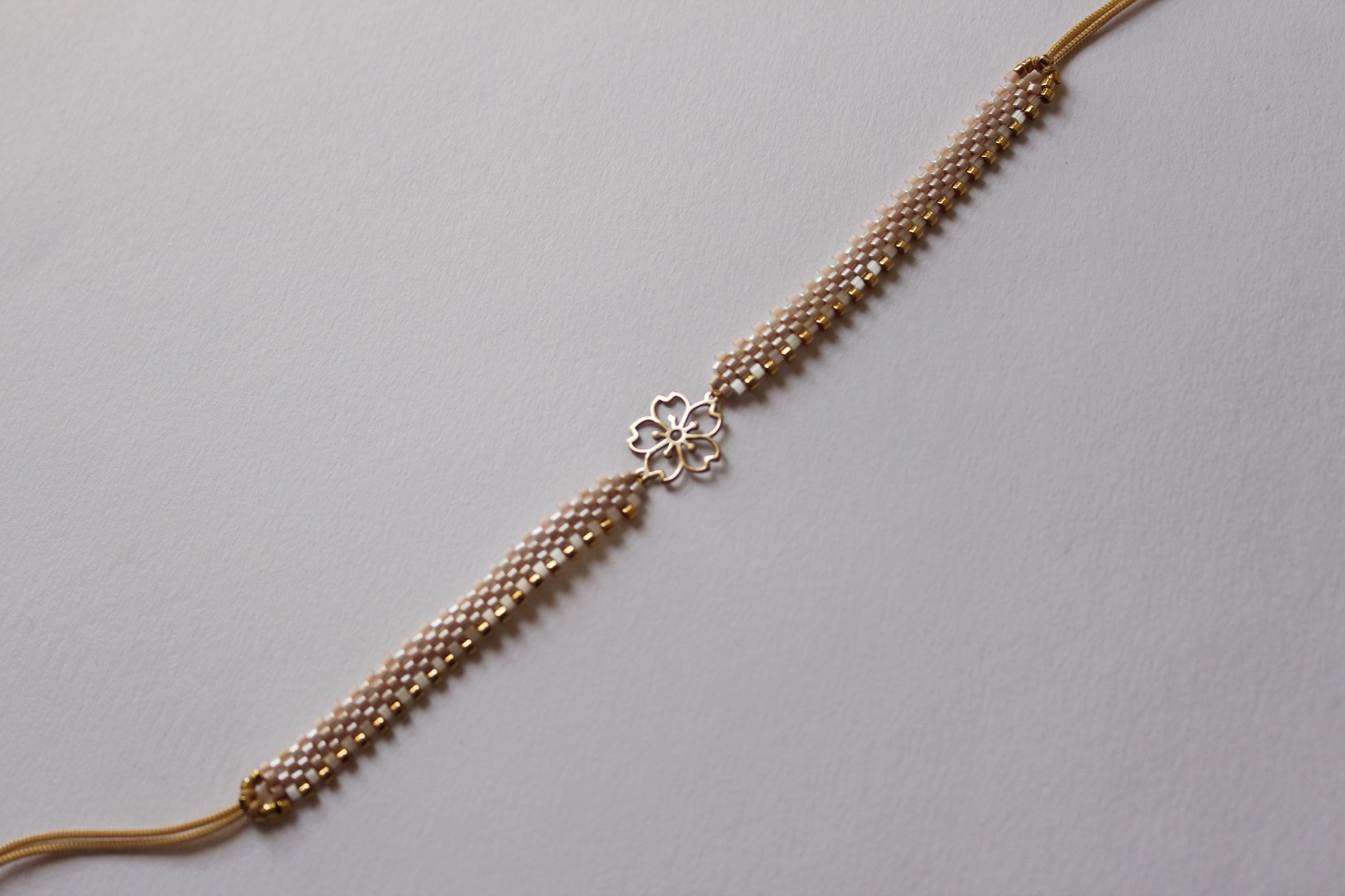 Handwoven with high-quality Japanese Miyuki beads in soft blush tones and subtle gold accents, this piece features a flower centerpiece crafted from solid 18K gold. The contrast between delicate beadwork and real gold creates a balanced, understated design.