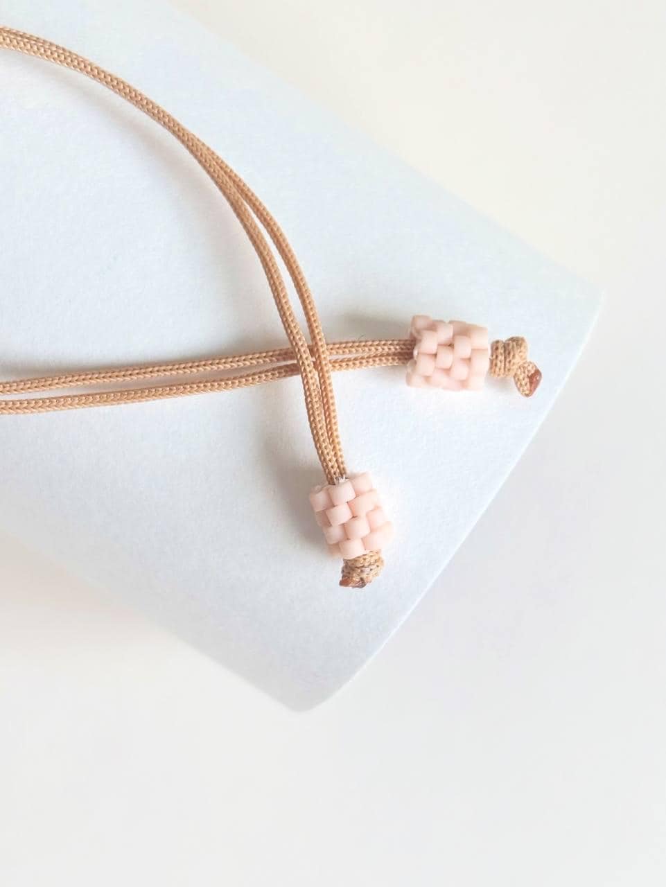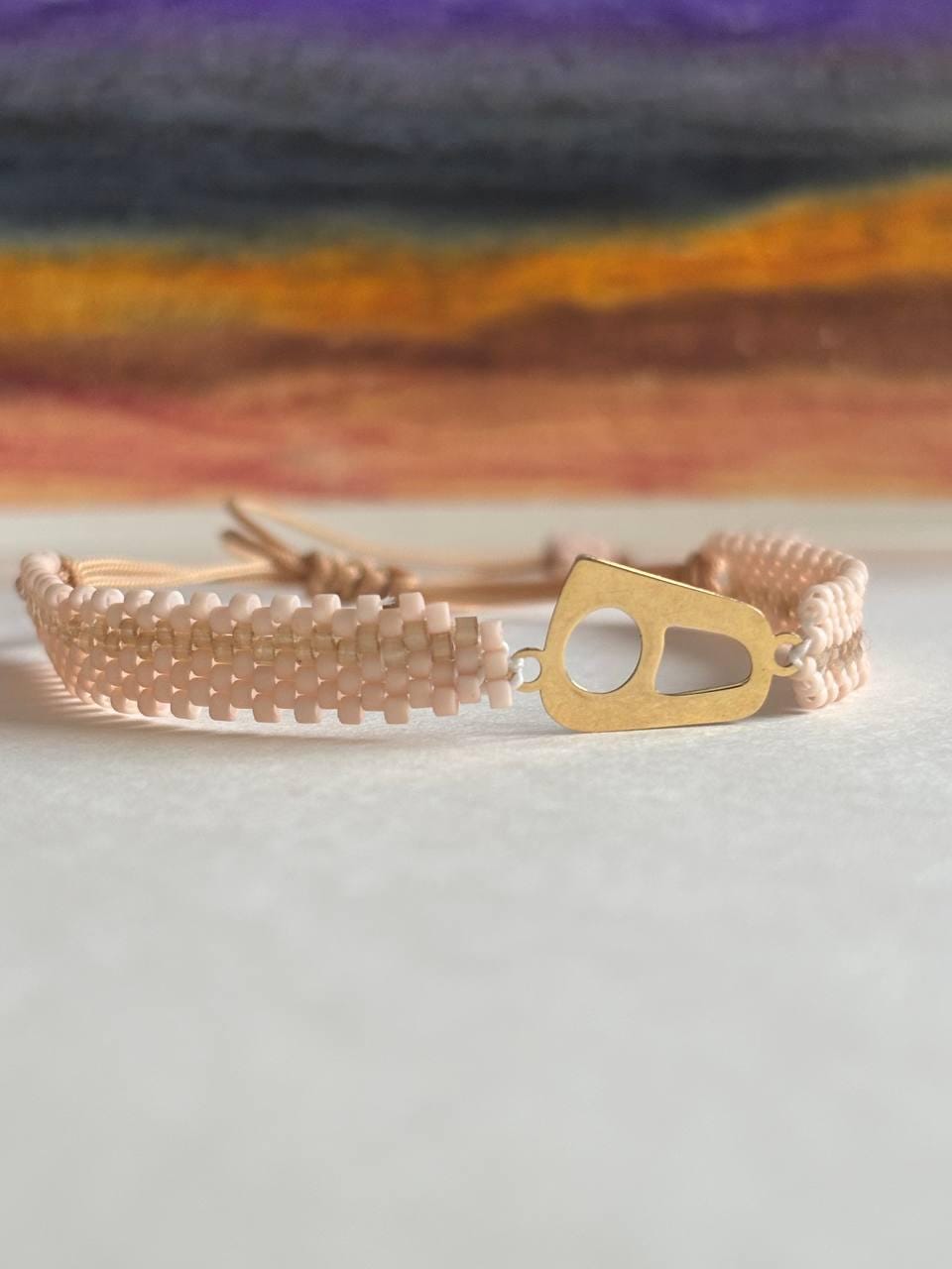 The bracelet is carefully handwoven with soft blush Miyuki beads, creating a subtle and elegant texture. At the center sits a minimalist charm shaped like the Persian letter “H”, giving the piece a unique cultural and poetic touch.